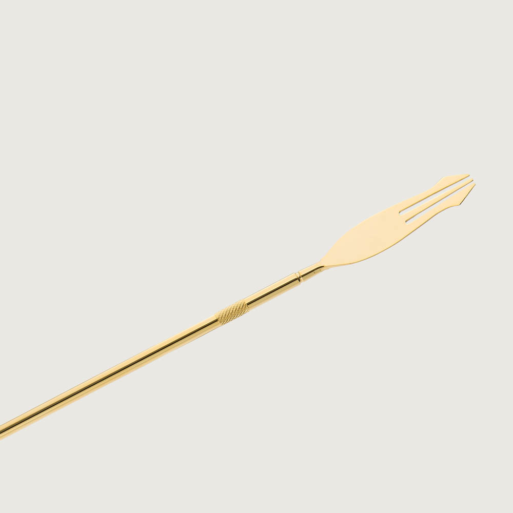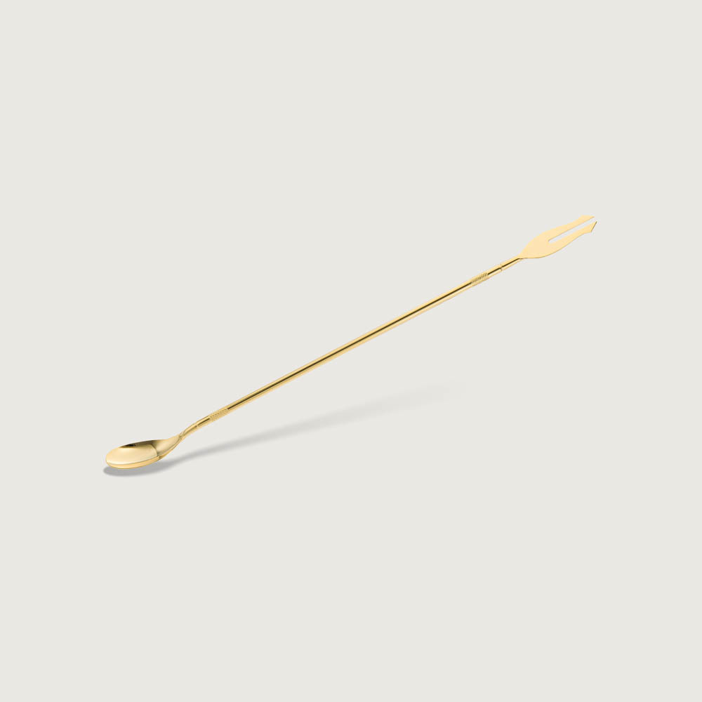 Japanese bar tools are visually striking and a pleasure to use and this bar spoon is no exception. Crafted out of high grade, durable 18-8 stainless steel, this spoon is elegant and perfectly balanced to make mixing drinks into an enjoyable ritual.  The no coil design makes mixing look and feel effortless and the trident end is perfect for spearing garnishes.